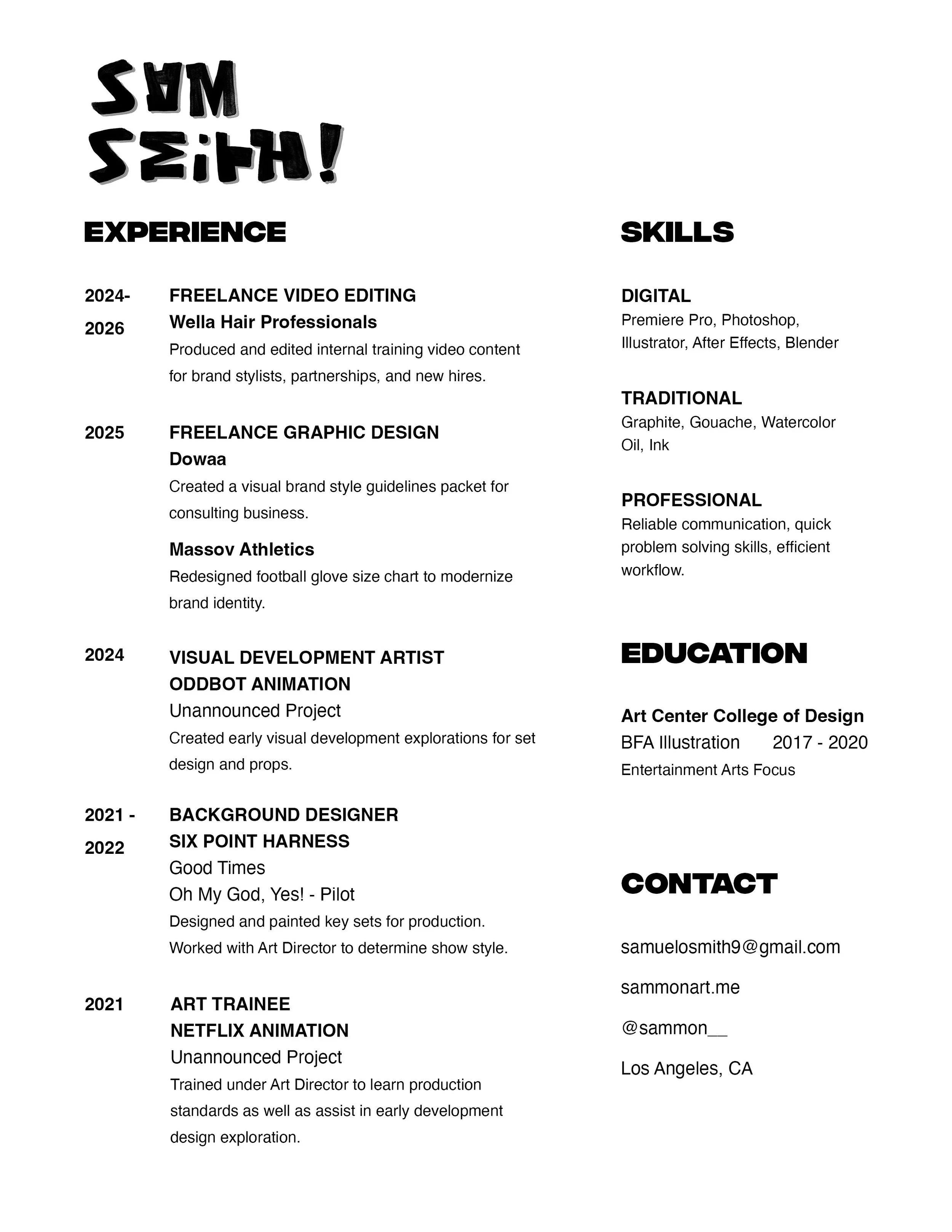 Hello! My name is Sam Smith, I am an illustrator and graphic designer living in Los Angeles. Across my body of work, I enjoy mixing different uses of texture and typography to mix different influences together. I have a few years experience as a background designer in the animation industry, having worked on several tv series. But I also love exploring the freedom of the blank page with my 3B pencil.